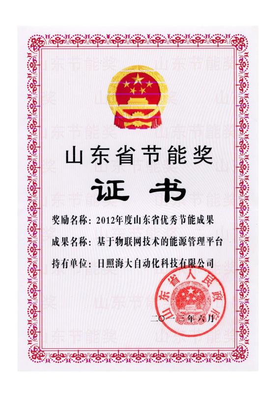 公司自主研發(fā)的“基于物聯(lián)網(wǎng)技術(shù)的綜合生產(chǎn)效率提升系統(tǒng)(OEE)”和“基于物聯(lián)網(wǎng)技術(shù)的能源管理系統(tǒng)”分別被評(píng)為“2014年度日照市科技進(jìn)步一等獎(jiǎng)”、“2013年日照市科技進(jìn)步二等獎(jiǎng)”,同時(shí)該成果也被評(píng)為“山東省優(yōu)秀節(jié)能成果獎(jiǎng)”(魯政辦發(fā)〔2006〕116號(hào))。公司自主研發(fā)的《石灰窯爐清潔生產(chǎn)自動(dòng)控制技術(shù)研究與應(yīng)用》獲得2010年度日照市科學(xué)技術(shù)進(jìn)步獎(jiǎng)二等獎(jiǎng),我公司2010年實(shí)施的《山東五征集團(tuán)有限公司風(fēng)機(jī)、水泵、空壓機(jī)系統(tǒng)節(jié)能項(xiàng)目》被歐盟SWITCH ASIA項(xiàng)目、中國節(jié)能協(xié)會(huì)節(jié)能服務(wù)產(chǎn)業(yè)委員會(huì)、中國標(biāo)準(zhǔn)化研究院評(píng)為“中國電機(jī)系統(tǒng)節(jié)能優(yōu)秀項(xiàng)目”。
