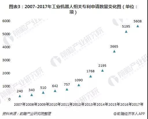 從申請專利數(shù)量來看,2007-2017年,我國工業(yè)機(jī)器人專利申請數(shù)量總體上呈上升的趨勢。2014-2016三年間,專利申請數(shù)量大幅增多;到2017年,工業(yè)機(jī)器人專利申請數(shù)量達(dá)到5608項(xiàng)。