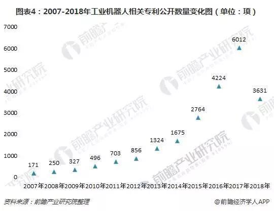 從公開專利數(shù)量來看,2007-2017年,我國工業(yè)機(jī)器人專利公開數(shù)量總體上呈趨勢。2017年,我國工業(yè)機(jī)器人專利公開數(shù)量為6012項(xiàng),達(dá)到近年來最大值;截至2018年6月,專利公開數(shù)量為3631項(xiàng)。