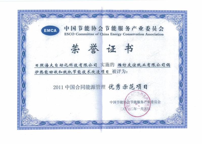 我公司實施的濰坊友誼紙業(yè)有限公司鍋爐熱能回收和紙機(jī)節(jié)能技術(shù)改造項目被中國節(jié)能協(xié)會節(jié)能服務(wù)產(chǎn)業(yè)委員會評為2011中國合同能源管理優(yōu)秀示范項目。