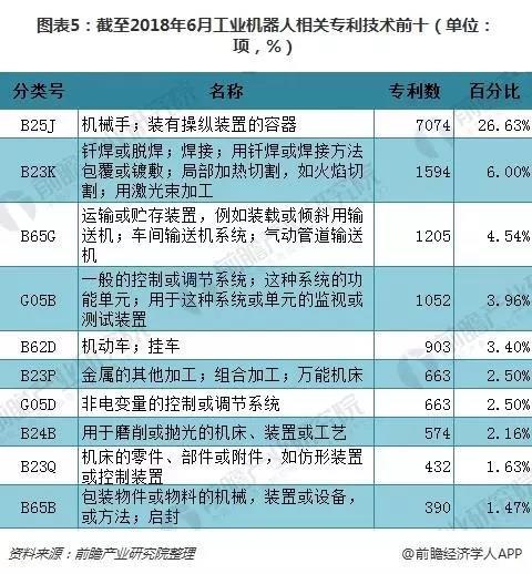 截至2018年6月,從我國工業(yè)機(jī)器人專利技術(shù)構(gòu)成來看,B25J(機(jī)械手;裝有操縱裝置的容器)專利申請數(shù)量排名第一,為7074項(xiàng),占比達(dá)到26.63%;B23K(釬焊或脫焊;焊接;用釬焊或焊接方法包覆或鍍敷;局部加熱切割,如火焰切割;用激光束加工)專利申請數(shù)排名第二,專利數(shù)量為1594項(xiàng),占比為6.00%;其余技術(shù)占比均在5%以下。