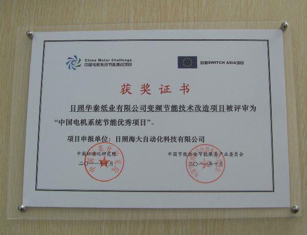 2011年10月13日在京舉行的中國(guó)電機(jī)系統(tǒng)節(jié)能頒獎(jiǎng)典禮及技術(shù)研討會(huì)上我公司的日照華泰紙業(yè)有限公司變頻節(jié)能技術(shù)改造項(xiàng)目被中國(guó)標(biāo)準(zhǔn)化研究院和中國(guó)節(jié)能協(xié)會(huì)節(jié)能服務(wù)產(chǎn)業(yè)委員會(huì)評(píng)審為“中國(guó)機(jī)電系統(tǒng)節(jié)能優(yōu)秀項(xiàng)目”。為推動(dòng)電機(jī)系統(tǒng)節(jié)能工程的實(shí)施,由中國(guó)標(biāo)準(zhǔn)化研究院、中國(guó)節(jié)能協(xié)會(huì)節(jié)能服務(wù)產(chǎn)業(yè)委員會(huì)、聯(lián)合國(guó)工業(yè)發(fā)展組織中國(guó)投資促進(jìn)辦公室、葡萄牙科因布拉大學(xué)等單位共同設(shè)計(jì)實(shí)施了歐盟SWITCH—ASIA項(xiàng)目框架下“中國(guó)電機(jī)系統(tǒng)節(jié)能挑戰(zhàn)項(xiàng)目”。只有實(shí)施并節(jié)能量顯著,技術(shù)先進(jìn)適用的電機(jī)系統(tǒng)節(jié)能項(xiàng)目,才能被評(píng)為“中國(guó)電機(jī)系統(tǒng)節(jié)能優(yōu)秀項(xiàng)目”獎(jiǎng)。